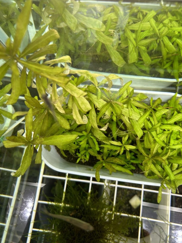 - 光量の不足:反対に、光量が極端に不足すると光合成ができずに枯れてしまいます。照明をつけたり、他の水草の陰に入っていないかチェックしましょう。また、枯れなくても照明が弱すぎると下枝が間延びすることもあります。