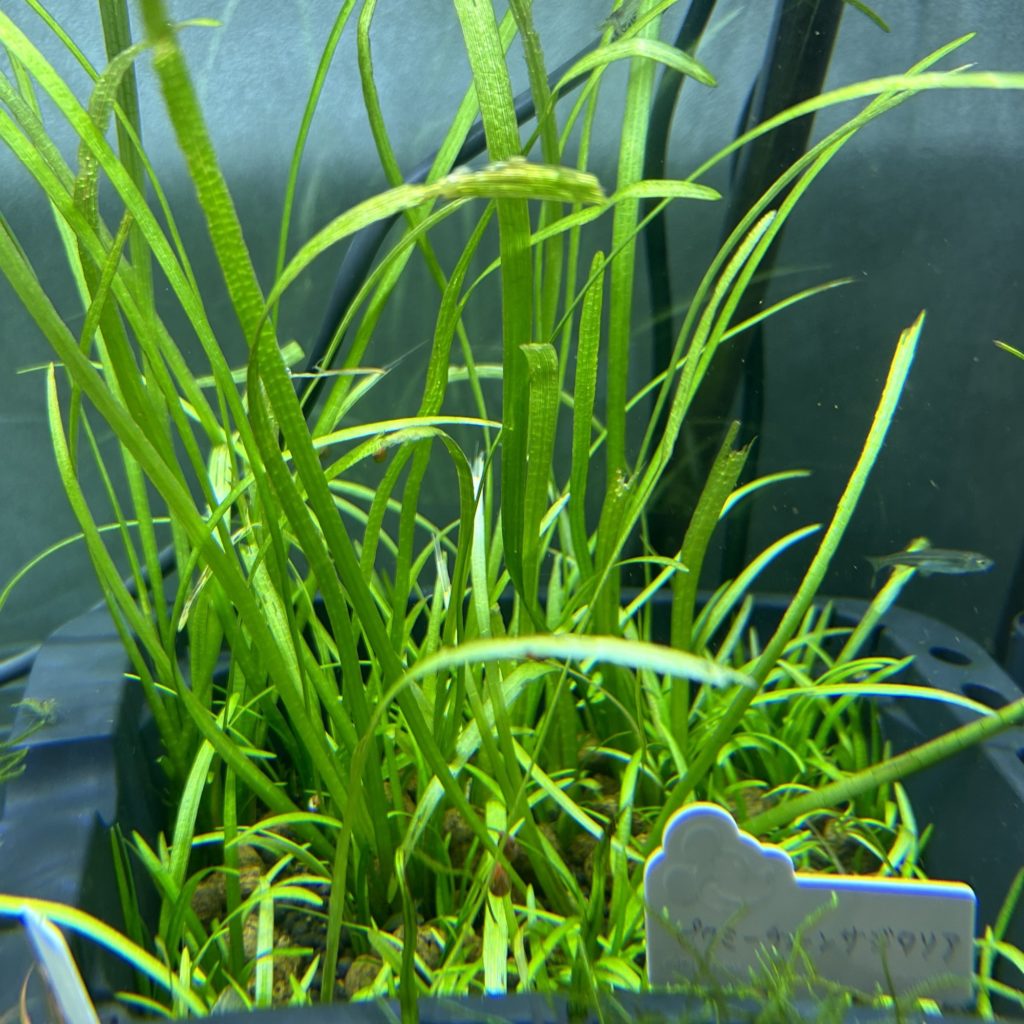 ピグミーチェーンサジタリア(学名: Sagittaria subulata var. pusilla)は、北米原産のロゼット型水草です。テープ状の細長い葉を株元から放射状に伸ばし、主に水槽の前景~中景に利用されます。名前に「ピグミー(=小型)」と付くものの、状態良く育成すると葉長は最大20~30cm程度に達することもあり、小型水槽では中景~後景、中~大型水槽なら前景~中景草として活用できます。葉幅はエキノドルス・テネルスより広めでボリュームがあり、葉色は鮮やかな緑一色(テネルスはやや赤みが差す)という違いがあります。全体的に丈夫で環境適応力が高く、初心者にも育てやすい水草として人気です。