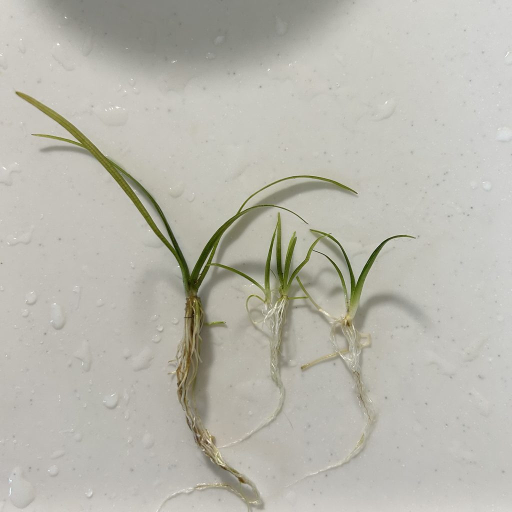 植え付けのポイントは「浮力の強い葉に負けないよう、根をしっかり底床に埋め込む」ことです。購入時はポットやウールに植えられている場合が多いので、まず根についたスポンジやウールを優しく取り除き、複数株がまとまっている場合は1~2株ずつ小分けにします。根が隠れる程度に底床へ挿し込みましょう。