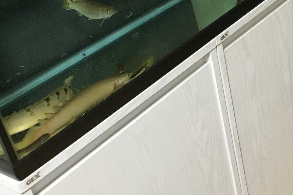 上写真では、テレビ台を水槽台代わりに使っています。家具自体の強度が十分で、かつ脚がない箱型の家具であるため安定しています。このように頑丈な構造の家具であれば60cm水槽(+30㎝金魚水槽)も設置可能です。