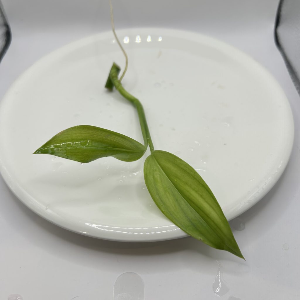 前述の通りヤマサキカズラは生命力が強く、健康な節があれば発根し、たとえ葉が無くても新芽を出すことも多いです。横方向に長く成長していくため、ある程度の長さになったら節を残してハサミでカットするだけで増やすことが可能です。葉を1枚以上残した形で節をカットするのが最も安全です。節は常に水に浸るよう管理して下さい。
